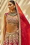 Featuring a crimson red lehenga in georgette and organza base with zari, zardosi, dori and floral motif embroidery. It is paired with an embroidered blouse having fringe detail and a sheer embroidered dupatta. Accentuate the designer lehenga with kundan polki or gold jewellery, embellished heels and a potli bag for a bridal look, Perfect wear for your wedding or engagement ceremony.