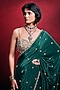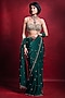 Tamanna Punjabi Kapoor presents a mesmerizing emerald green saree crafted in a crepe and tissue base, adorned with intricate stone, resham, mirror, pearl, sequin, dori, poth, and zari work. It is paired with an embroidered blouse and a stretch satin underskirt. Accentuate with polki jewellery and embellished heels for a regal look, perfect for grand festive occasions, engagement or mehendi ceremonies.