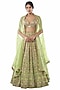 Featuring a green lehenga skirt in georgette base with foil, resham and mirror embroidery. It is paired with a matching blouse and cape.