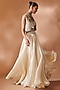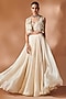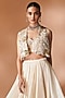 Featuring an ivory jacket in raw silk base with gold embroidery. It is paired with an embroidered blouse and an organza skirt. Accentuate it with kundan polki or zircon jewellery, embellished heels and a potli bag for a wedding or engagement ceremony.