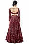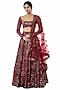 Featuring a maroon lehenga skirt in net base with foil, resham and mirror embroidery. It is paired with a matching blouse and dupatta.