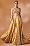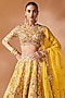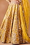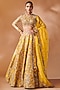 Featuring a mustard lehenga in chanderi base with mirror, resham and gota embroidery. It is paired with a blouse and an organza dupatta. Accentuate it with kundan polki or zircon jewellery, embellished heels and a potli bag for a wedding, haldi or engagement ceremony.