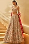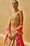 Featuring a nude and fuchsia lehenga in tulle and organza base with resham, sequins, pearls, gota, dori, mirror and badla embroidery. It is paired with an embroidered bustier and an embroidered dupatta. Accentuate the designer lehenga with polki or swarovski jewellery, embellished heels and a clutch for a bridal look, Perfect wear for your wedding or engagement ceremony.