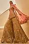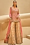 Featuring an onion pink kurta in tissue and raw silk base with gota, zari, pearls, sequins, mirror, dori, zardosi and resham embroidery. It is paired with gold embroidered sharara pants and a sheer organza embroidered dupatta. Accentuate the designer sharara with gold or polki jewellery, embellished heels and a potli bag for a bridal look, Perfect wear for your wedding or engagement ceremony.