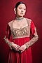 Tamanna Punjabi Kapoor presents a mesmerizing red anarkali in crepe base, adorned with intricate dori, zari, pearl, sequin, mirror, poth, and gota work. It is paired with churidar and a dupatta. Accentuate with statement jhumkas and embellished heels for a timeless festive look, perfect for grand festive celebrations or wedding functions.