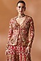 Featuring a red jacket in georgette base with resham, gota and mirror embroidery. It is paired with sharara pants. Accentuate it with kundan polki or zircon jewellery, embellished heels and a potli bag for a wedding or sangeet ceremony.