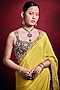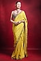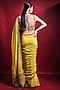 Tamanna Punjabi Kapoor presents a mesmerizing yellow and purple saree crafted in a crepe base, adorned with intricate dori, pearl, sequin, poth, zari, stone, mirror, patra and nakshi work. It is paired with an embroidered blouse and a stretch satin underskirt. Accentuate with polki jewellery and embellished heels for a regal look, perfect for grand festive occasions, engagement or haldi ceremonies.