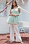 Featuring a sea green handcrafted jacket in georgette, crepe, and net base with floral detailing and tassel. It is paired with contrasting white flared pants and a dupatta.