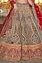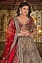 Tanaksh presents an emerald green and maroon lehenga in velvet base with kiran dori, dabka, cutdana and sequins embroidery. It is paired with an embroidered blouse and a net dupatta. Style this designer lehenga set with statement kundan jewellery, potli bag and elegant block heels, Perfect for brides seeking an elevated and timeless bridal look.