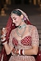 Tanaksh presents a light peach lehenga in net base with kiran dori, dabka, cutdana and sequins embroidery. It is paired with a red embroidered blouse and a net dupatta. Style this designer lehenga set with statement kundan jewellery, potli bag and elegant block heels, Perfect for brides seeking an elevated and timeless bridal look.