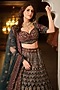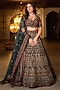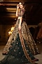 Tanaksh presents a maroon and teal green lehenga in net base with velvet patch, dabka, dori and sequins embellishments. It is paired with an embellished blouse and a dupatta. Style this designer lehenga set with statement kundan jewellery, potli bag and elegant block heels, Perfect for brides seeking an elevated and timeless bridal look.
