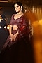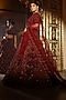 Tanaksh presents a maroon lehenga in velvet base with dabka, crystal and dori embroidery. It is paired with an embroidered blouse and a net dupatta. Style this designer lehenga set with statement kundan jewellery, potli bag and elegant block heels, Perfect for brides seeking an elevated and timeless bridal look.