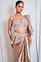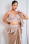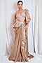Featuring a peach draped saree in organza base. It is paired with a net blouse having sequins, zarkan and cutadan embellishments. Accentuate it with statement jewellery and heels for cocktail parties or wedding ceremonies.