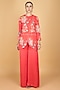 Featuring a coral pink overlay top in georgette base with floral print and machine embroidery. It is paired with modal silk pants. Accentuate it with delicate jhumkas and embellished juttis. Perfect for festive gatherings, family functions and traditional daytime events.