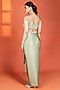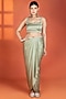 Featuring a green jacket in raw silk base with floral print and hand embroidery. It is paired with a modal satin inner and a draped skirt. Accentuate the designer set with kundan polki or gold jewellery, embellished heels and a potli bag for an elegant look, Perfect wear for your cocktail, sangeet or engagement ceremony.