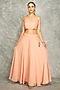 Featuring a peach cape in organza base with floral print. It is paired with a soft georgette bustier and organza skirt. Accentuate it with statement jewellery and heels for a festive occasion, wedding or sangeet ceremony.