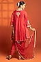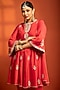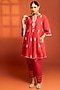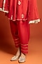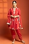 Featuring a red short flared kurta in cotton silk base with embroidery. It is paired with salwar pants and a sheer net dupatta. Accentuate the designer set with kundan polki or gold jewellery, embellished heels and a potli for an elegant look, Perfect wear for festive, sangeet or engagement ceremony.