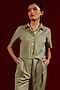 Featuring a green jumpsuit in viscose and polyester base with a concealed placket. It is paired with a belt. Style it with a pair of flats or sandals for a formal or casual look.