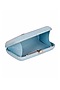 Featuring a pastel blue clutch in poly silk base with glass beads and thread embellishments, including a gold frame and a stone encrusted tablet clasp. It has a poly silk lining and a gold chain.