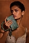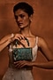 Featuring a teal clutch in brocade, malmal and viscose satin base with beaded tassel embellishment, metallic silk thread and brass motif detailing. It has a structured top handle. Our bags add effortless glamour to any occasion, perfect for parties, weddings, and events.