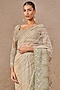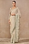 Tarun Tahiliani presents an aqua and gold saree in tulle base with resham and sequins hand embroidery. It is paired with a blouse. Accentuate the designer saree with kundan polki or emerald jewellery, embellished heels and a potli bag, perfect wear for a wedding or sangeet ceremony.