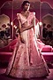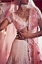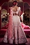 Featuring a beige bridal lehenga in velvet base with 3D floral gota, aari, resham, laser cut trellis, and zardosi embroidery. It is paired with a matching blouse and tulle scallop dupatta.