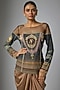 Tarun Tahiliani features a Beige T-shirt that captivates with its elegance. The eye-catching piece is crafted in foil jersey with print, swarovski crystal work and TT monogram detailing. Accentuate it with a skirt, dangler earrings and heels for an evening wear.