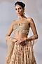 Tarun Tahiliani features a mesmerizing Beige Lehenga Set that captivates with its elegance. The eye-catching lehenga is crafted in organza with metallic dome, crystal and floral motifs embroidery. It is paired with a structured bustier and a tulle scarf. Style it with statement jewellery and heels for a wedding or engagement ceremony, showcasing style and sophistication.