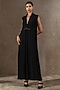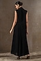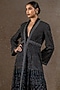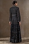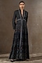 Tarun Tahiliani presents a black A-line draped dress in chiffon base with a hand embroidered brooch. It is paired with a tulle net sequins embroidered long jacket. Accentuate it with diamond jewellery and embellished heels for evening soirees.