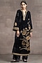 Featuring a black kurta in velvet base with floral print, gold work and hand embroidery. It is paired with matching flared pants.