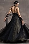 Featuring a black and gold draped lehenga in crinkle net and crinkle tulle base with ruched detailing. It is paired with a matching sequins embroidered blouse having a geometrical back cut-out and a dupatta.