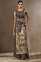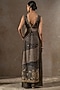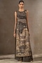 Tarun Tahiliani presents a black pichwai jumpsuit in lace fabric and sheer silk base with crystal, thread and zardosi embellishment, including kashida embroidery. Accentuate it with kundan polki or meenakari jewellery, embellished heels and a potli bag for a complete look, perfect wear for a sangeet or cocktail ceremony.