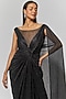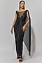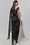 Tarun Tahiliani features a black draped dress in metallic crinkle base with crystals and knotting detail. Accentuate it with statement jewellery and heels for a cocktail party.