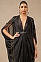 Tarun Tahiliani features a mesmerizing Black Kaftan Style Dress that captivates with its elegance. The eye-catching piece is crafted in metallic crinkle tulle with brooch hand embroidery and crystal highlight. It comes with a slip. Accessorize the designer dress with dangler earrings and block heels for cocktail parties, showcasing style and sophistication.