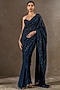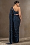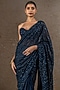 Tarun Tahiliani presents a blue saree in satin base with sequins embroidery. It is paired with a sequins embroidered tulle net corset blouse. Accentuate it with gold jewellery and embellished heels for weddings, sangeet ceremony or cocktail soirees.