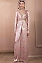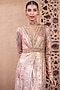 Tarun Tahiliani features a mesmerizing Blush Pink Jumpsuit that captivates with its intricate garden print. The eye-catching piece is crafted in metallic foil jersey with embroidery. The designer jumpsuit is perfect for weddings and festive occasions, showcasing style and sophistication.