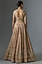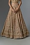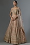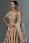 Tarun Tahiliani features a blush pink lehenga in sheer silk and indian tulle base with paisley detail, including french knot, sequins, dabka and cutdana embroidery. It is paired with a blouse and a dupatta. Accentuate it with statement jewellery and heels for weddings or sangeet ceremonies.