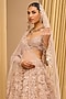Tarun Tahiliani presents a blush pink lehenga in indian tulle base with crystal and sequins embellishments, including thread embroidery. It is paired with a blouse and an embroidered dupatta. Accentuate the designer lehenga with kundan polki or emerald jewellery, embellished heels and a potli bag, perfect wear for a wedding or sangeet ceremony.