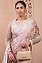 Tarun Tahiliani features a mesmerizing Blush Pink Saree Set that captivates with its intricate paisley print. The eye-catching saree is crafted in satin organza with embroidered borders. It comes with a matching lace blouse to complete the ensemble. The designer saree set is perfect for weddings and festive occasions, showcasing style and sophistication.