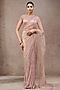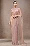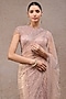 Tarun Tahiliani presents a blush pink saree in soft net base with sequins embroidery and swarovski crystal embellishment. It is paired with an embroidered blouse. Accentuate it with statement jewellery and heels for weddings or sangeet ceremonies.