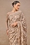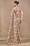 Tarun Tahiliani presents a blush pink saree in tulle base with sequins and floral embroidery. It is paired with an unstitched blouse fabric. Accentuate it with statement earrings and heels for festive occasions or weddings.