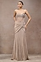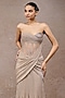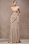Tarun Tahiliani presents a champagne draped corset gown in crinkle net base with swarovski crystal detail. Accentuate it with statement jewellery and heels for cocktail parties.