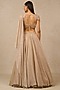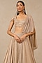 Tarun Tahiliani features a mesmerizing Champagne Skirt Set that captivates with its elegance. The eye-catching skirt is crafted in crinkle with an attached drape. It comes with a matching tulle blouse having hand embroidery and fringe detail to complete the ensemble. The designer skirt set is perfect for weddings, showcasing style and sophistication.