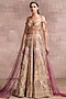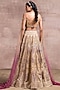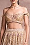Featuring a fuchsia kalidar lehenga in laser-cut gota fabric with crystal embellishments. It is paired with a matching off-shoulder blouse having an attached wing.