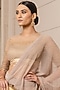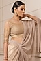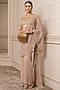 Featuring a gold pre-draped saree in foil jersey base with fringe detailing. It is paired with a blouse having fringe embellishments and a sheer panel. Accentuate it with statement earrings and heels for a sangeet or engagement ceremonies.