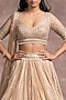 Featuring a gold kalidar lehenga in silk organza and sheer brocade base with pearl waistband and a gota border. It is paired with a matching mirror embroidered blouse and a dupatta.