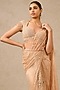 Tarun Tahiliani features a mesmerizing Gold Concept Saree Set that captivates with its elegance. The eye-catching concept saree is crafted in lace with embroidered panels. It is paired with a jaal embroidered soft net blouse having crystal fringes. Accessorize the designer saree set with a statement necklace and heels for a wedding or engagement ceremony, showcasing style and sophistication.