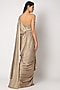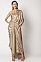 Featuring a golden pre-draped concept saree in shantoon base with one side cape detail. It is paired with a matching sequins bustier in dolphin woven base.