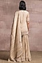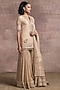 Featuring an ivory and gold kalidar short kurta in silk organza base with fringes and mirror hand embroidery. It is paired with matching sharara pants and a brocade dupatta having pearls, dabka, and tikki embroidery.