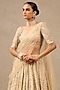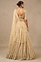 Tarun Tahiliani features a mesmerizing Ivory & Gold Lehenga Set that captivates with its elegance. The eye-catching lehenga is crafted in tulle with art deco panels, sequins and cutdana embroidery. It is paired with an embroidered blouse, including a tulle drape having crystals and tassel details. Accessorize the designer lehenga set with dangler earrings and heels for wedding ceremonies, showcasing style and sophistication.